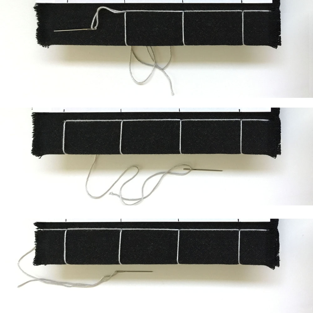 The thread passes through each of the four points three times, from various directions, never overlapping the visible stitching. The path of the thread alternates in over/under fashion in one direction then reverses to join back with the first stitch.