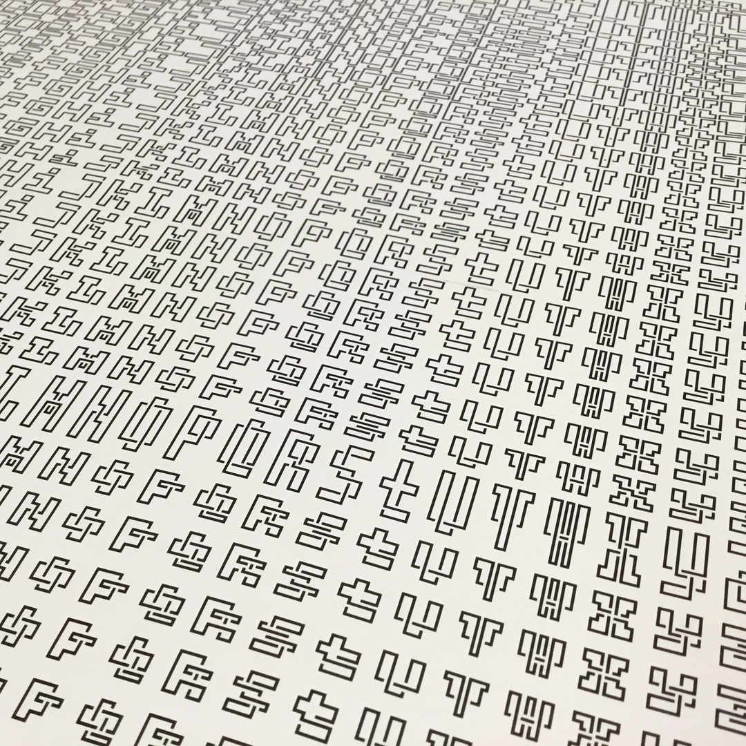And these are the solid fonts. For each of the lined and solid variants I made an array of heights and widths to fit the weaving grid in various combinations. I found myself going back and forth between the layout compositions and the fonts. I would use a font in my layout, then start editing the layout bitmap, then go back and edit a font variant with those changes, and repeat. In the final layout, I would further edit details to finesse the particular letter pairing. That's the interplay between fonts and lettering.
